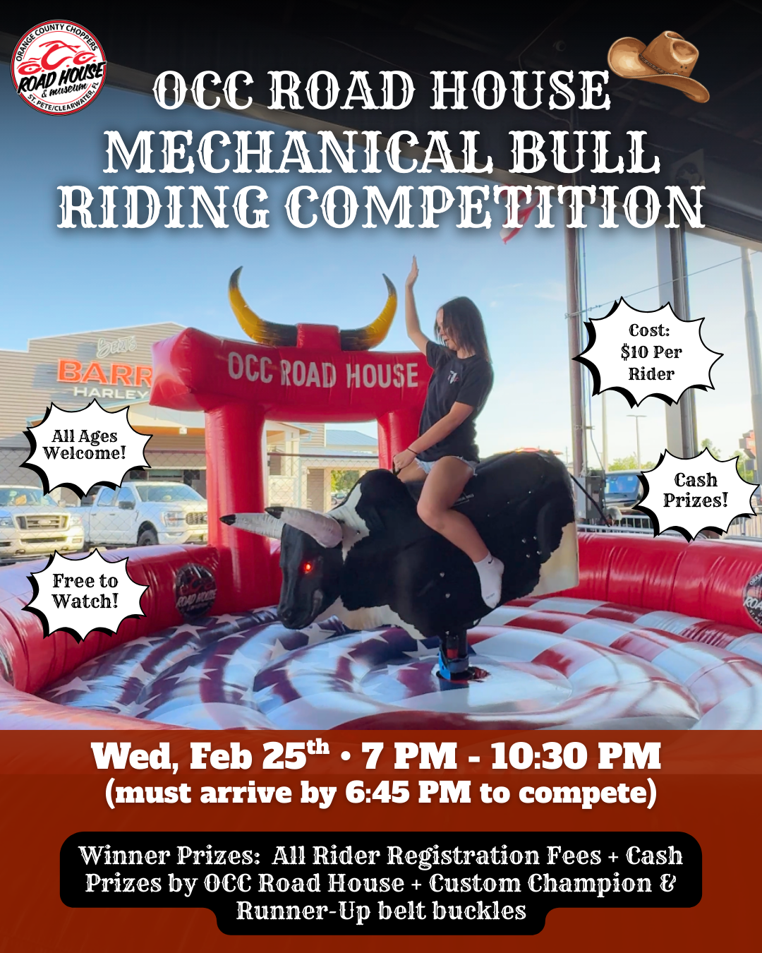 Winner Prizes: All Rider Registration Fees + cash prizes added by OCC Road House + Custom Champion and Runner Up Belt Buckles